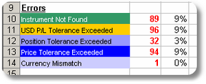 As well as these discrepancies, other error conditions can also arise. For example, an instrument may be missing from one data source, or it may be listed with the wrong currency. These errors are highlighted directly in the data, and summarised at the end of the reconciliation.